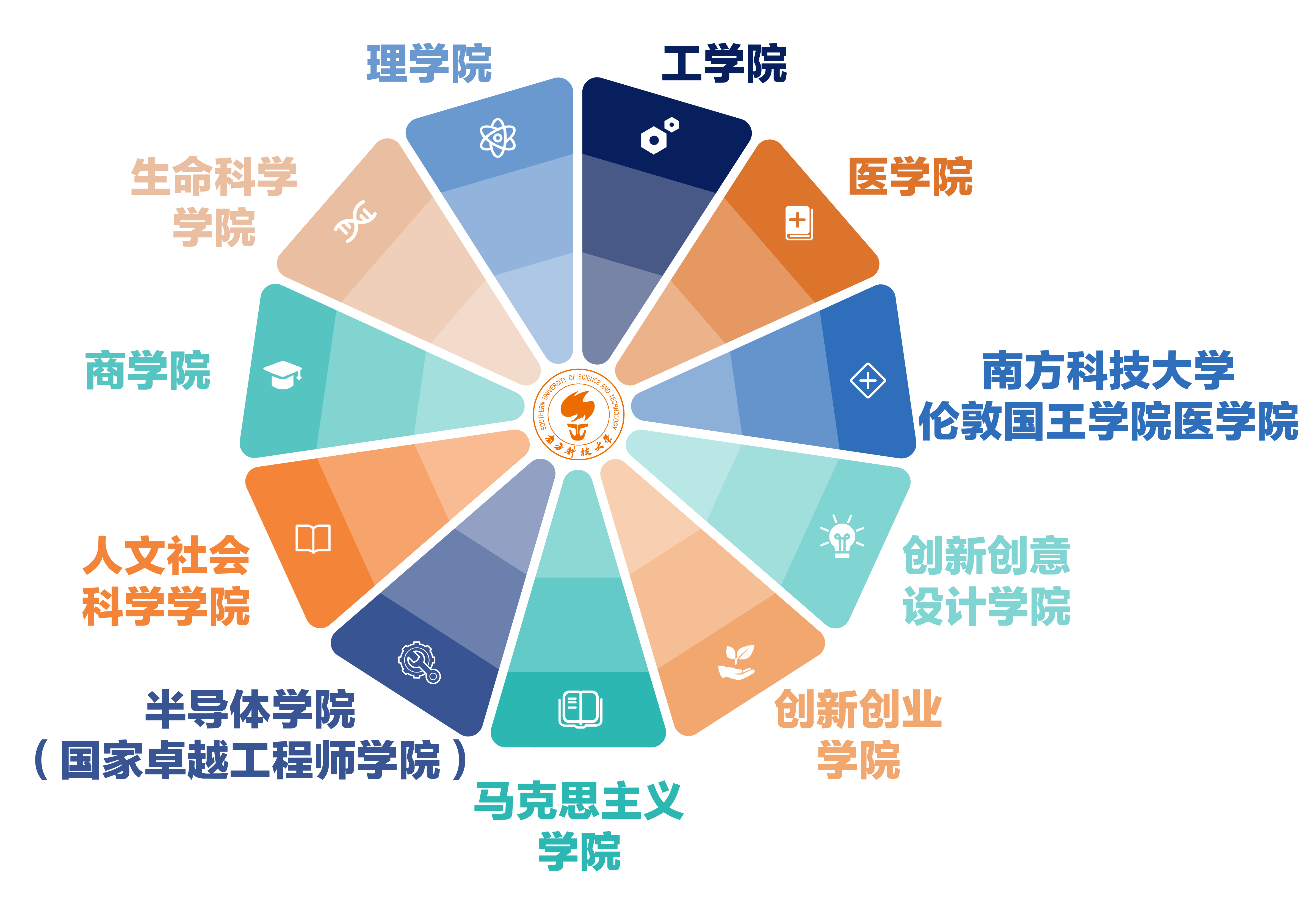 南科大借鉴世界一流理工科大学的学科设置和办学模式,以理、工、医为主,兼具商科和特色人文社科的学科体系,在本科、硕士、博士层次办学,在一系列新的学科方向上开展研究,使学校成为引领社会发展的思想库和新知识、新技术的源泉。学校系科和学科专业设置紧跟学科发展前沿,面向国家战略性新兴产业发展,重点发展与新能源、新材料、新一代信息技术、节能环保、生物技术与生物医药等相关的新兴学科专业和交叉学科。